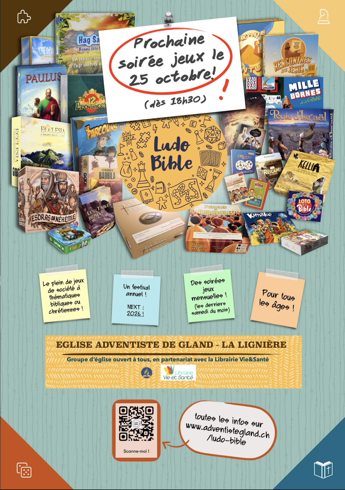 Nous contacter contact@ludobible.org Lieu des activités locales Église adventiste du septième jourLa Lignière 12, 1196 GlandSuisse Nous suivre SuivreSuivreSuivreSuivre